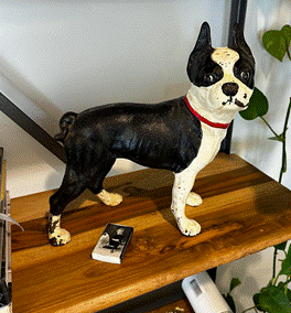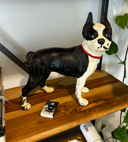 At a flea market, it’s okay to haggle on prices. For instance, this iron Boston Terrier dog had a $45 price tag on it. I negotiated and the seller let it go for $30.