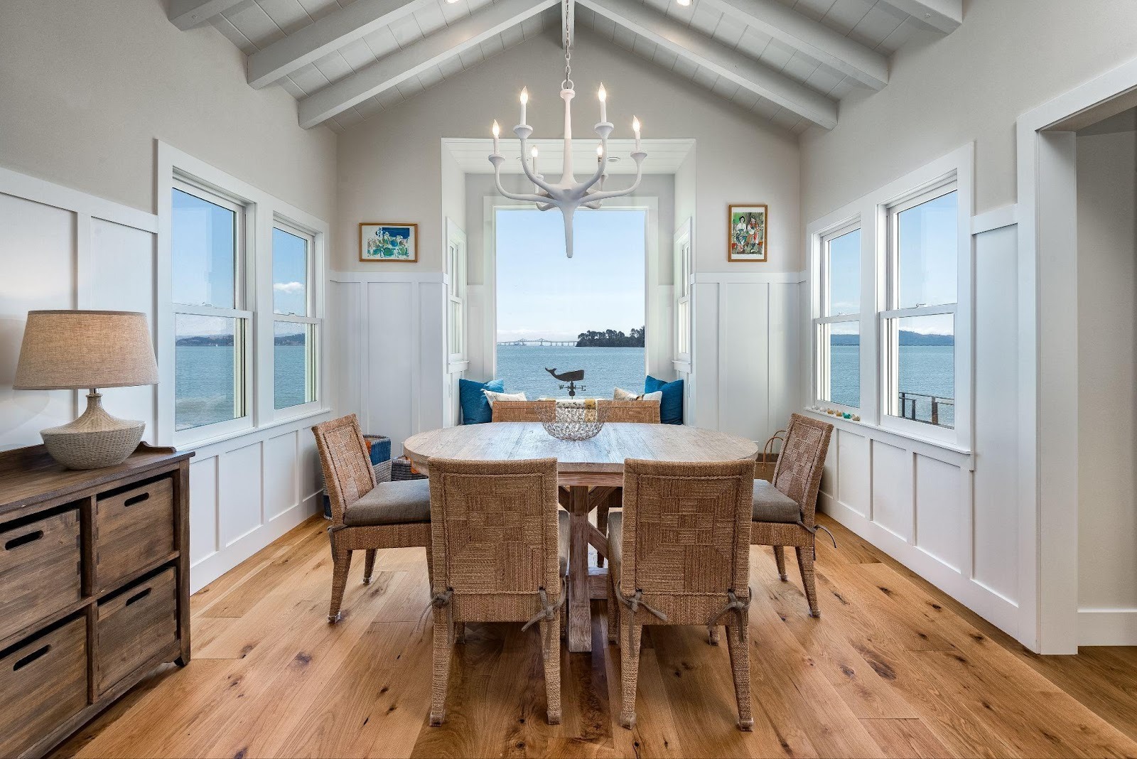 Crafted of wrought iron, this minimalistic white chandelier has a softness and beauty that belies its materiality. We used it in the dining room below to make a strong statement without detracting from the stunning water views.