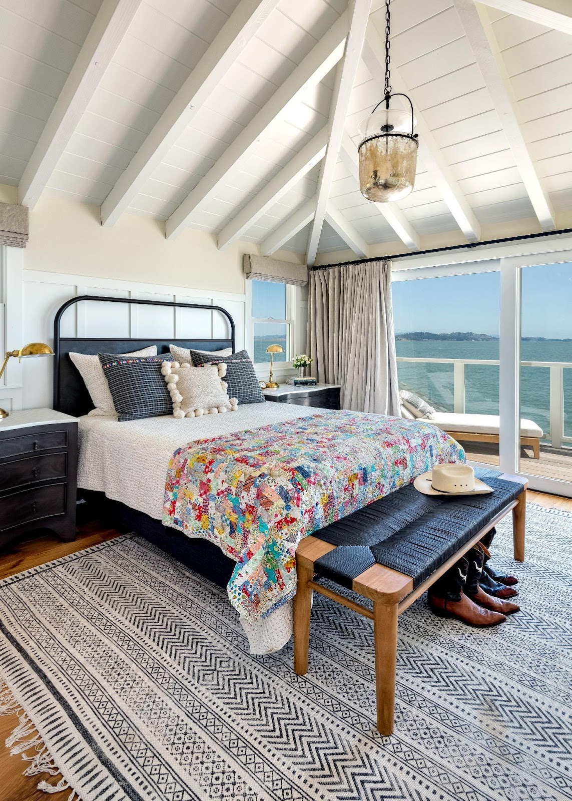 This lantern-style light fixture has a whimsical nautical quality that fits right into this waterfront bedroom. Featuring an aged-iron frame and mercury glass lantern, it has a voluptuous silhouette that sets the mood for the entire space.